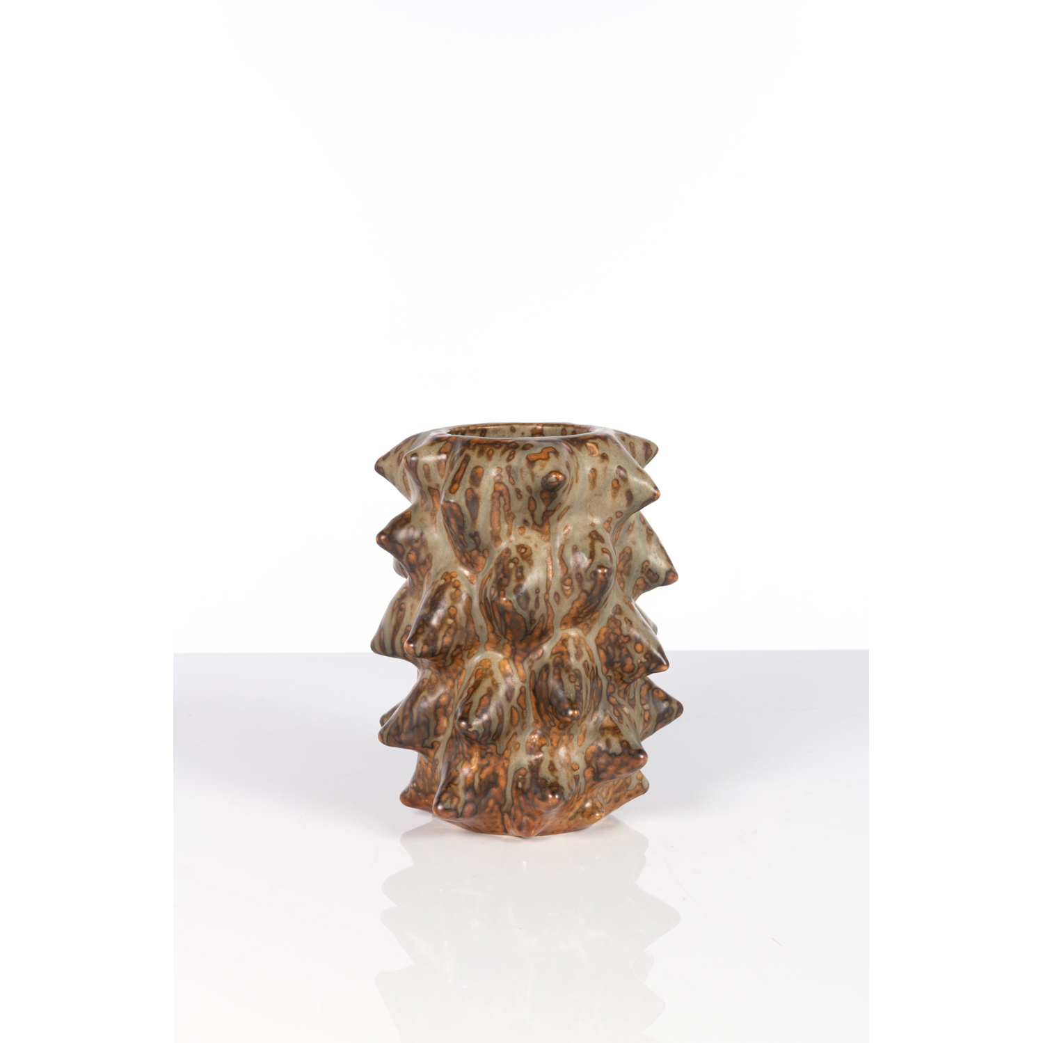 C’est en 1925 à l’Exposition universelle de Paris qu’Axel Salto fait preuve de son talent dans le domaine de la céramique avec des premiers travaux en porcelaine, émaux sur biscuit, exécutés par le fabricant danois Bing & Grøndahl. Dans le domaine du grès, Salto commence modestement, dans un petit établissement où l’on pouvait suivre et contrôler de près tous les détails de l’exécution et, avec Carl Halier, céramiste avisé, il parvient à posséder parfaitement matière et technique. Plus tard, dans des conditions plus favorables, il collabore avec la céramiste Nathalie Krebs. A partir de 1933, il fait exécuter tous ses ouvrages par la Manufacture Royale de Copenhague, ayant ainsi à sa disposition les ressources techniques d’une grande fabrique. L’artiste fait preuve d’un véritable don d’observation de la nature dans laquelle il puise pour imaginer ses nouvelles créations en grès. Après le style « cannelé » basé sur de simples motifs répétitifs en zigzag vient le style « bouton » ou « bourgeon », inspiré par les châtaignes et les fruits d’eucalyptus.