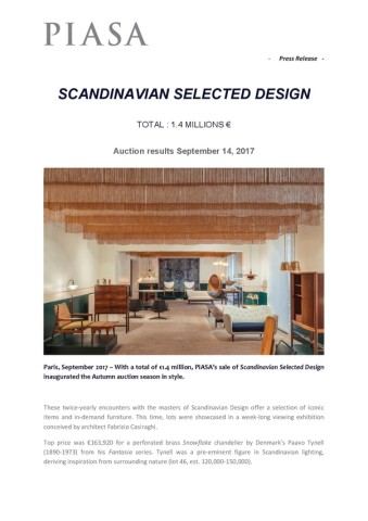 Paris, September 2017 – With a total of €1.4 million, PIASA’s sale of Scandinavian Selected Design inaugurated the Autumn auction season in style.