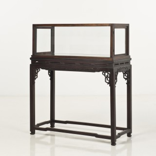 CHINE - Vers 1900Console en palissandre à décor sculpté sur le côté de frises de grecques stylisés. Une vitrine rectangulaire posée ...
