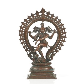 INDE – XIXe siècleStatuette de Shiva Nataraja en bronze, debout sur une jambe dansant sur un démon devant une auréole.H.25,5 cm