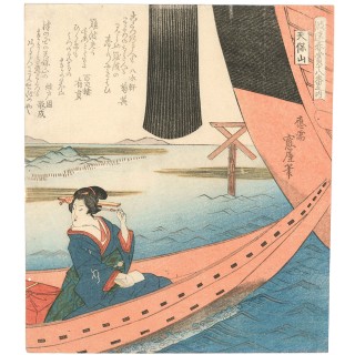 Madoya ? Surimono shikishiban, jeune femme dans une barque. ...
