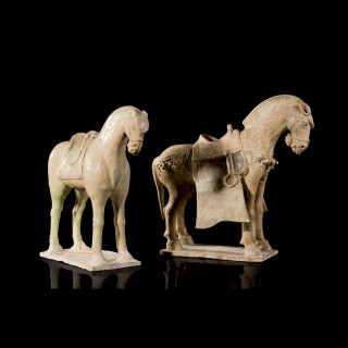 CHINE - Époque SUI (581 - 618)Deux chevaux en terre cuite émaillée beige et
