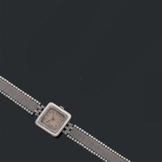 Montre-bracelet de dame Art Déco en or gris 18K (750‰) de forme carrée. Fond guilloché à chiffres romains peints (décoloration), aig...