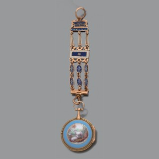 Montre de gousset en ors de deux tons 18K (750‰) finement ciselé et émaillé polychrome ornée d'une scène de bergerie. Cadran émaillé...