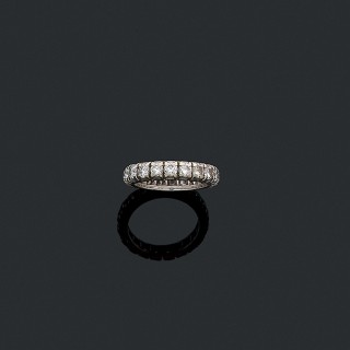 CARTIER. Anneau en or gris 18K (750‰) agrémenté du sigle de la marque et de cinq diamants taille brillant en serti clos. Signé et nu...