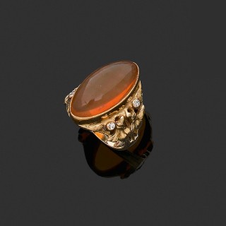 Bague marquise en or jaune 18K (750‰) ajouré à décor de feuilles ornée de petits diamants et d'un cabochon d'opale de feu sertie clo...