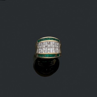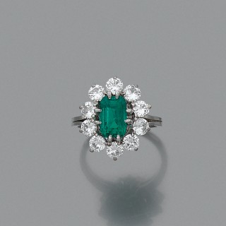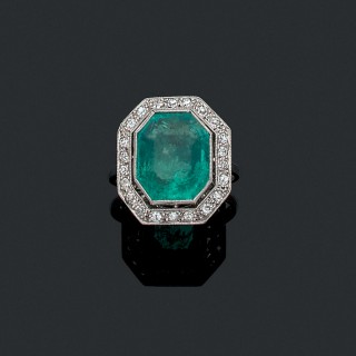 Bague octogonale en platine (850‰) centrée d'une émeraude rectan ...