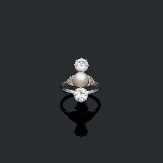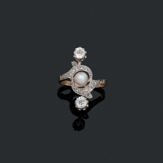 Bague ancienne en or jaune 18k (750‰) et platine (850‰) formant des volutes centrée d'une perle Mabé, encadrée par deux diamants tai...