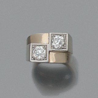 Bague Art Déco en or gris 18k (750‰) et platine (850‰) ornée de deux diamants taille ancienne en sertissure carrée disposés en quinc...