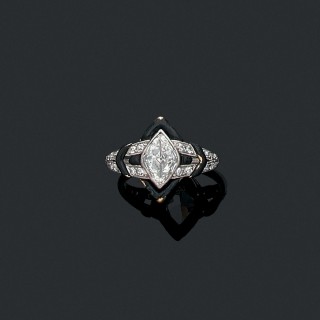 Bague Art Déco en platine (850‰) et or gris 18K (750‰) orné d'un diamant de forme losange et de taille ancienne (fluorescence forte)...