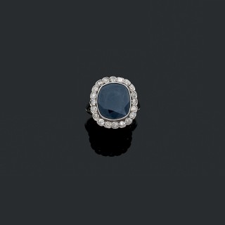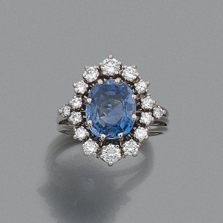 Bague en or gris 18K (750‰) à fils centrée d'un saphir ovale calibrant 3,40 carats environ dans un entourage de diamants taille bril...
