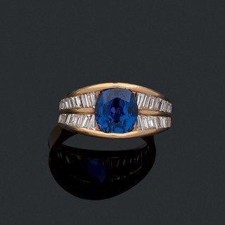 Bague en or jaune 18K (750‰) centrée d'un saphir taille ovale calibrant 4,1 carats environ, épaulé de lignes de diamants taille tape...