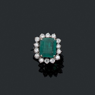Bague octogonale en platine (850‰) centrée d'une émeraude rectangulaire à pans coupés (fêle à la culasse) calibrant 6,50 carats envi...