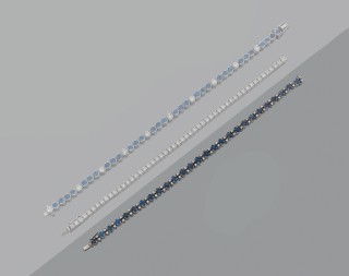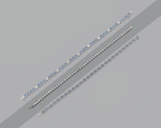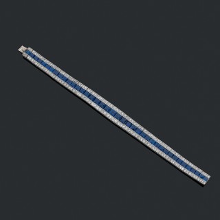 Bracelet ruban souple en platine (850‰) centré d'une ligne de saphirs calibrés (certains probablement chauffés) épaulés de diamants ...