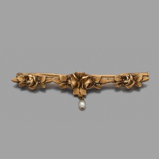 Broche barrette en or jaune 18K (750‰) finement ciselé de roses retenant une perle en pampille