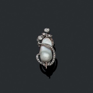 Broche en or et argent ornée d'une importante perle fine baroque et de diamants taille ancienne et taillés en rose.XIXe siècle. Poid...