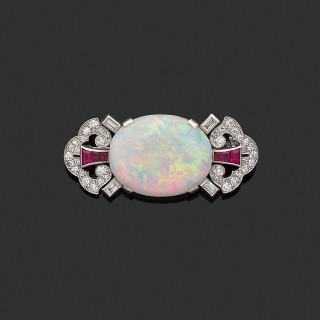 Broche en platine (850‰) centrée d'un important cabochon d'opale ...