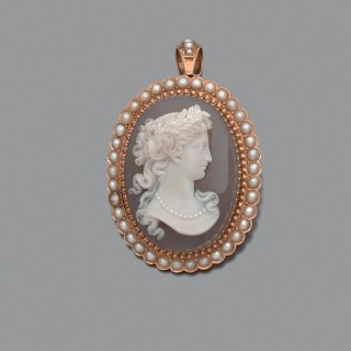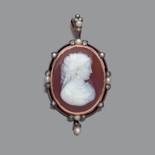 Broche/pendentif ovale en or rose 18K (750‰) ornée d'un camée sur cornaline à décor d'une femme de profil dans un entourage de perle...