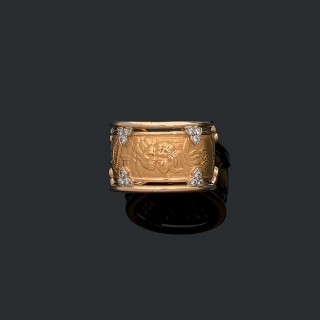 Bague chevalière de dame en or jaune 18K (750‰), la partie centr ...