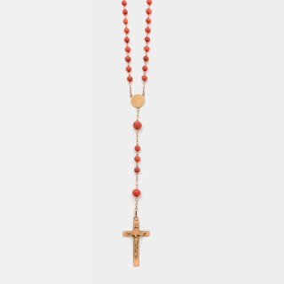Chapelet en or jaune 18K (750‰) agrémenté de perles de corail, la croix datée au dos "25 Décembre 1911"