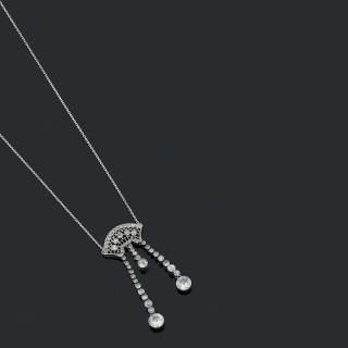 Collier de 72 perles fines en chute. Fermoir en or gris 18K (750‰) orné d'un diamant taille brillant et de diamants taillés en rose....
