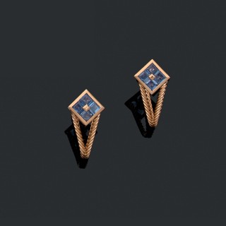 Paire de boutons de manchettes en or jaune 18K (750‰) torsadé et lisse, ils sont agrémentés chacun de quatre saphirs calibrés