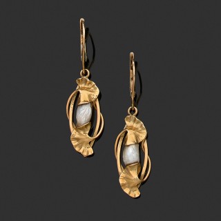 Paire de pendants d'oreilles Art Nouveau en or jaune 18K (750‰) à décor de feuilles de papyrus ornés au centre d'une perle baroque.P...