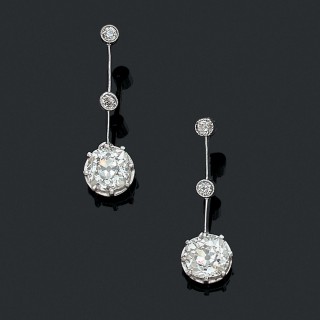 Paire de pendants d'oreilles en platine (850‰) et or gris 18K (750‰) sertis de deux diamants taille ancienne calibrant chacun 1,30 c...