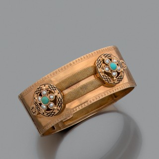 Parure en or jaune 18K (750‰) composée d'un large bracelet articulé orné de motifs ronds centrés de cabochons de turquoise et de dem...