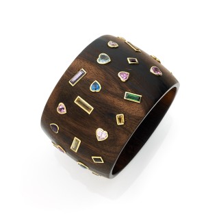 Cuff bracelet in fruitwood studded with semi- precious stones (citrine, amethyst, aquamarine,