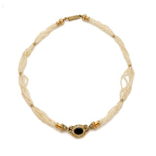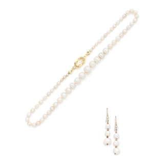 Necklace with 49 natural pearls, round, button and oval shaped and 7 cultured pearls, clasp in 18k