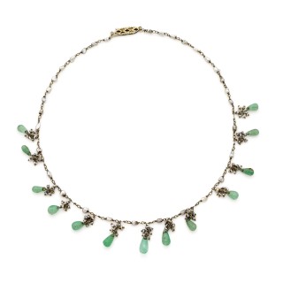Delicate drape necklace in silver (800‰), with thirteen tasseled emerald drops and small baroque pearls,