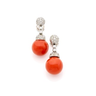 Pair of ear pendants in 18k (750‰) white gold each adorned with a vintage cut diamond, cushion or