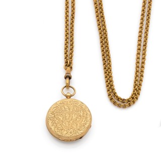 Montre de col en or jaune 750‰ signée S. Devaulx, le fond du boîtier est gravé de rinceaux et feuillages, retenue par un long sautoi...