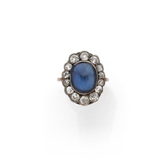 Bague marguerite en or et argent ornée d'un saphir taillé en cabochon (éclats et égrisures) serti clos dans un entourage de diamants...