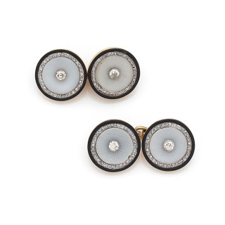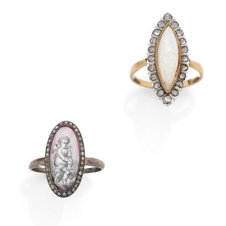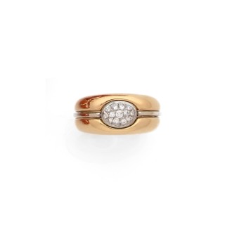 Bague marquise en or jaune 750‰ à décor de lignes sinueuses émaillées noir délimitant des champs pavés de diamants taillés en rose, ...