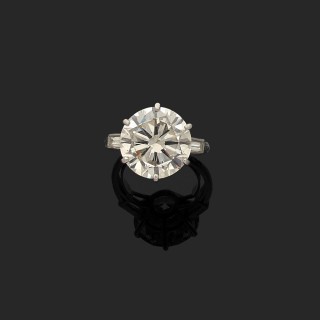 Bague en platine centrée d'un diamant demi taille calibrant 5,80 carats environ, le panier ajouré à décor de résille.Tdd : 50