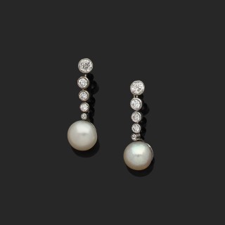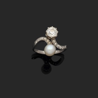 Bague "Vous et Moi" ornée d'une perle fine bouton et d'un diaman ...