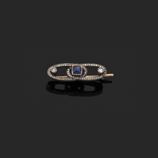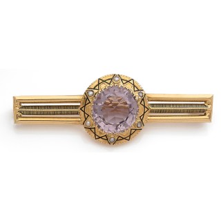 Broche barrette en or jaune 750‰ ciselé ornée de filets d'émail noir, la partie centrale formant une rosace agrémentée d'une améthys...