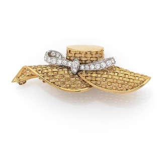 Broche "chapeau de paille" en fils d'or jaune 750‰ tressés, agrémenté d'un ruban noué en or gris serti de diamants.Années 1960