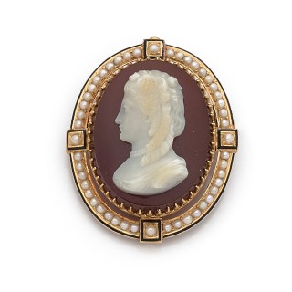 Broche en or jaune 750‰ ornée d'un camée sur agate cornaline à d ...
