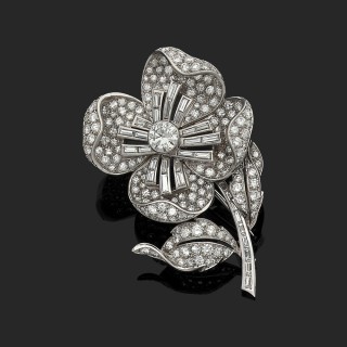 Broche "Fleur" en platine 850‰ et or gris 750‰ entièrement sertie de diamants taille brillant, elle est ornée au centre d'un diamant...