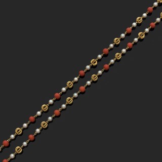 CARTIER. Années 1960.Sautoir en or jaune 750‰ orné de sphères ajourées alternées de boules de corail et perles de culture. Signé, nu...