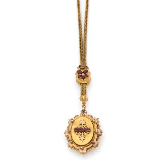 Collier en or jaune 750‰ orné d'un médaillon porte-souvenir ovale ouvrant rehaussé de rubis et perles fines.Tour de cou double chaîn...