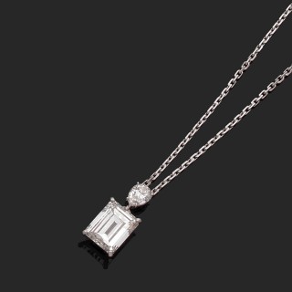 Collier orné d'un diamant rectangulaire à pans coupés taillé à degrés de 3,86 carats retenu par un diamant taillé en poire.Tour de c...