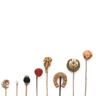 Ensemble de 8 épingles de cravate en or, certaines rehaussées de diamants taillés en rose, demi-perles et émail : fer à cheval (tige...