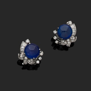 Paire de boucles d'oreilles en platine 850‰ serties de cabochons de saphirs calibrant 6,4 et 6,5 carats environ, entourés de diamant...