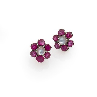 Paire de dormeuses en or rose de forme marguerite ornées au centre d'un cabochon de pierre de lune entouré de rubis ronds.Vers 1860.