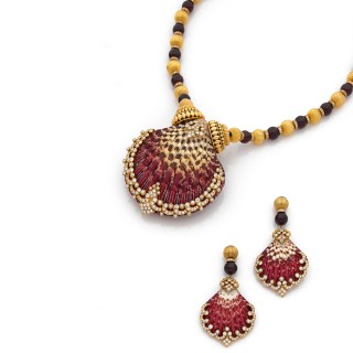 Parure comprenant un collier et une paire de pendants d'oreilles ornés de coquillages naturels agrémentés de motifs volute sertis de...