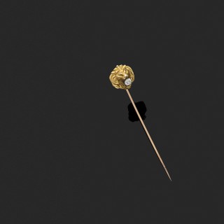 René BOIVIN.Épingle de cravate en or jaune 750‰ à décor de tête de lion tenant dans sa gueule un diamant taille ancienne calibrant 0...